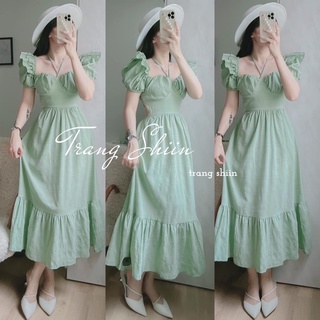 ĐẦM XANH MIDI DÂY CHÉO CỔ TAY BỒNG