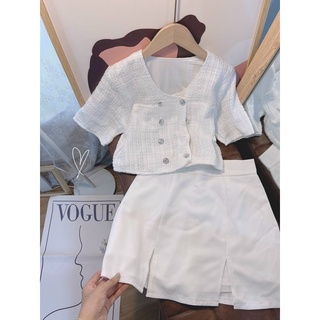 SET ÁO DẠ NÚT + CHÂN VÁY TRẮNG XẺ