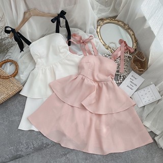ĐẦM ĐỎ 2 DÂY XỐP ĐÍNH NƠ RỚT VAI