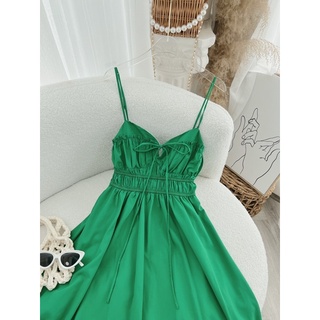 ĐẦM XANH MIDI BO CHUN NGỰC THẮT NƠ 2 DÂY