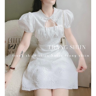 ĐẦM CỔ VUÔNG TAY PHỒNG DÂY NGỰC CHÉO TRẮNG - ĐEN