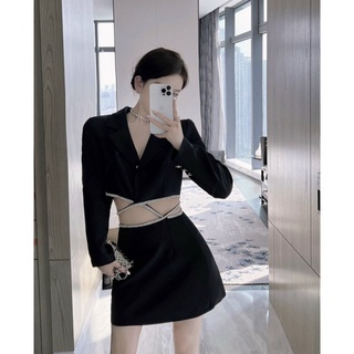 SET ÁO VEST ĐEN ĐÍNH CƯỜM CỘT EO CHÉO DÂY + CHÂN VÁY