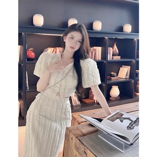 SET ÁO CROPTOP DẠ TRẮNG TAY VOAN KHÚC + CHÂN VÁY DÂY KÉO LÓT QUẦN MS98