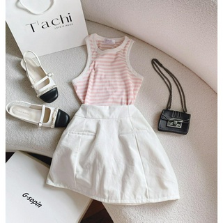 SET ÁO SÁT NÁCH BA LỖ SỌC HỒNG + CHÂN VÁY TRẮNG
