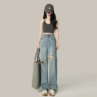 COZOK Quần Jean Ống Rộng Lưng Cao Phối Rách Cá Tính Thời Trang