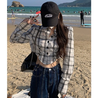 COZOK Áo Sơ Mi Tay Dài Dáng Ngắn Họa Tiết Sọc Caro Thời Trang