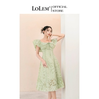 Đầm xòe cổ vuông LOLEM DX321 tay lỡ phối tơ ren vải thô họa tiết dập nhăn