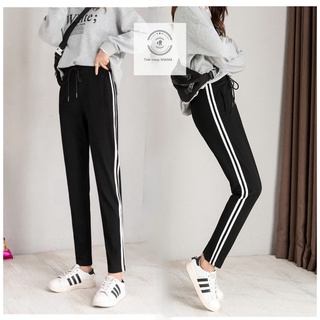 Quần thể thao nữ dài đen dây rút chất vải umi dày mát phối một sọc trắng co dãn 4 chiều Quần jogger nữ cá tính cạp chun