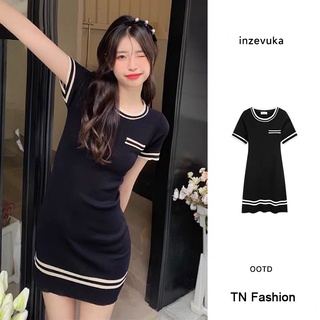 Váy body dệt kim len nữ dáng ôm tay ngắn cổ tròn đen trắng hàng Quảng Châu thiết kế trẻ trung
