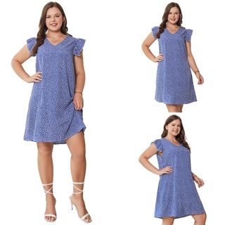 Đầm Lovito dễ chịu thân thiện với da thướt tha cổ V lai bèo xếp nếp chấm bi boho tôn dáng size lớn LPS01056 (Xanh lam)