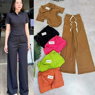 Đồ bộ nữ, set đồ bộ quần ống rộng đai cao có túi, áo croptop sơ mi ôm ngắn tay vải thun gân, bộ đồ mặc ở nhà, quần áo nữ