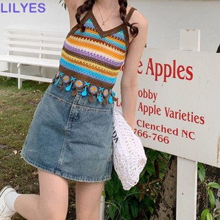 LILYES Áo Croptop Dệt Kim Không Tay Cổ Vuông Màu Sắc Cầu Vồng Phong Cách Bohemian y2k