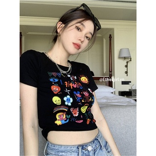 Ethelgirl Áo Thun Croptop Tay Ngắn Dáng Ôm In Họa Tiết Kiểu Retro Mỹ Xinh Xắn Cho Nữ