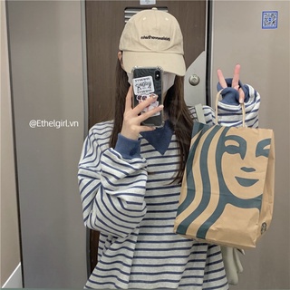 Áo thun tay dài dáng rộng rãi họa tiết kẻ sọc phong cách Hàn Quốc thời trang sành điệu cho nữ