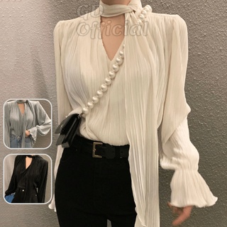A34|Áo sơ mi cổ chữ V tay bèo chất xếp ly nhẹ nhàng vintage cho nữ màu trắng, xanh, đen GD Official