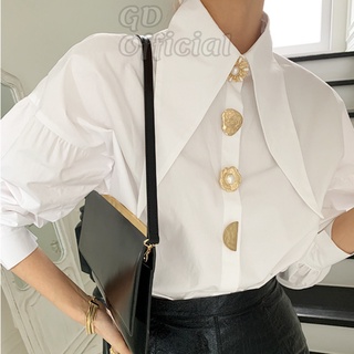 A77|Áo sơ mi polo cotton nữ trơn cổ tròn dài tay loe phồng xếp ly thanh lịch,sang trọng suông rộng màu trắng GD Official