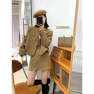 Set Áo Khoác Len Dáng Ngắn + Chân Váy Xẻ Tà Lưng Cao Thời Trang Hàn Quốc 2022