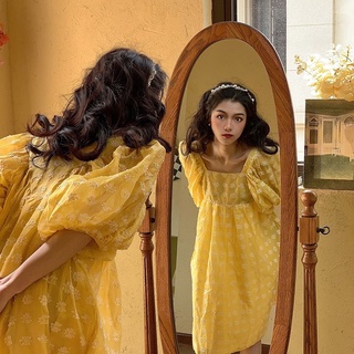 Đầm Tay Phồng Cổ Vuông Họa Tiết Hoa Cúc Phong Cách Retro