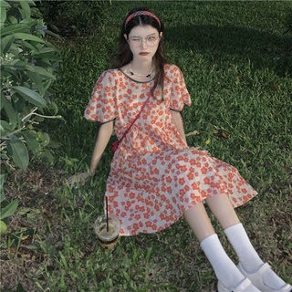 Đầm hoa cổ tròn tay phồng thắt dây phong cách cổ điển thời trang dành cho nữ