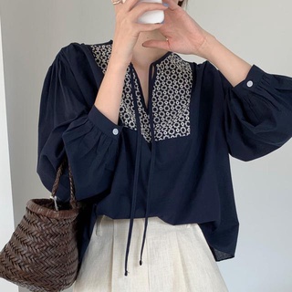 Áo Kiểu Tay Dài Cổ Chữ V Thêu Họa Tiết Hoa Phong Cách retro Hàn Quốc Thời Trang