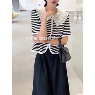 Áo Len Ngắn Tay Họa Tiết Kẻ Sọc Màu Sắc Tương Phản Phong Cách retro Thời Trang Hàn Quốc
