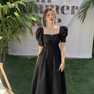 Đầm tay phồng dài cổ vuông màu đen kiểu Pháp retro