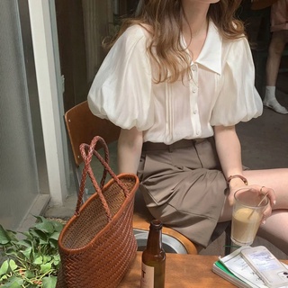 Set Áo Tay Ngắn Phồng + Chân Váy Lưng Cao Phong Cách Hàn Quốc Thời Trang Cho Nữ