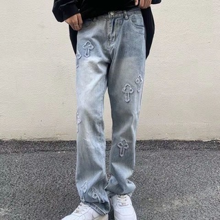 Quần jean lưng cao hoạ tiết chữ thập phong cách Âu Mỹ đường phố 2021