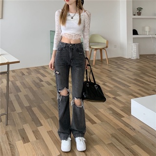 ☸❦Quần Jeans Lưng Cao Ống Rộng Thiết Kế Xẻ Rách Phong Cách Đường Phố Nhật Bản