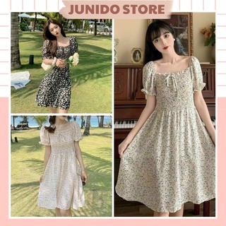 Váy hoa nhí cổ vuông, váy hoa nhí vintage dáng dài chun ngực JUNIDO