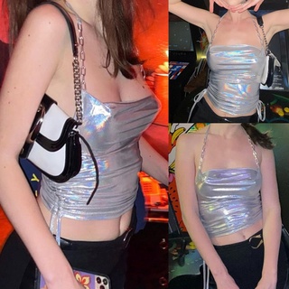 Áo Lửng Hai Dây Cổ Chữ V Ánh Kim Loại Lấp Lánh Gợi Cảm Cho Nữ