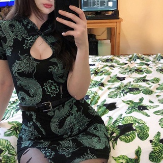 Brroa Đầm Sườn Xám Ngắn Tay Xẻ Tà Cổ Đứng Xẻ Tà In Hình Rồng Phong Cách Trung Hoa Cổ Điển Cho Nữ