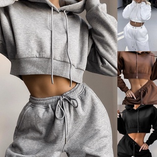 Set Đồ Thể Thao 2 Món Áo Hoodie Tay Dài Phối Quần Dài Màu Sắc Trơn Thời Trang Cho Nữ
