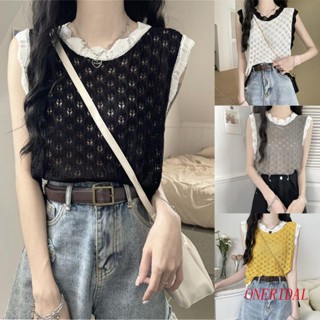 Áo Croptop Dệt Kim Sát Nách Cổ Tròn Phối Ren Rỗng Thời Trang Cho Nữ