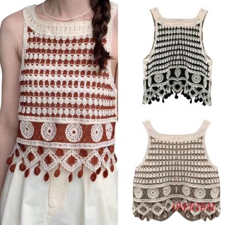 Áo Croptop Dệt Kim Không Tay Phối Tua Rua Hạt Nhiều Màu Sắc Phong Cách Dân Tộc Cho Nữ