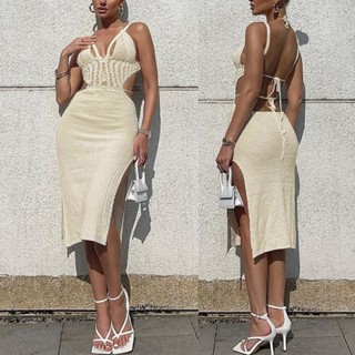 Đầm Midi Cổ Chữ V Khoét Sâu Hở Lưng Đan Móc Xẻ Tà Quyến Rũ Thời Trang Đi Biển Cho Nữ