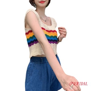 Áo Sweater Dệt Kim Cổ Tròn Không Tay Màu Cầu Vồng Thời Trang Dành Cho Nữ
