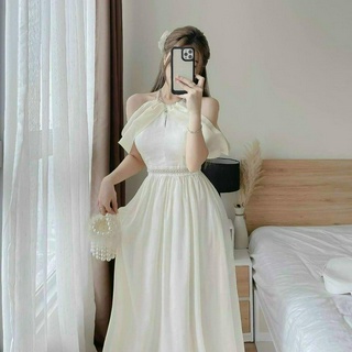 Đầm váy cổ yếm trễ vai tay bồng mix nơ sau dáng dài tiểu thư Gs085