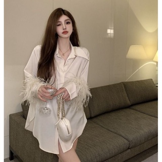 Cổ Phiếu Sẵn Sàng❤Ah F & X Áo Sơ Mi Satin Phối Lông Xù Phong Cách Nữ Thần Cá Tính Thời Trang 2022