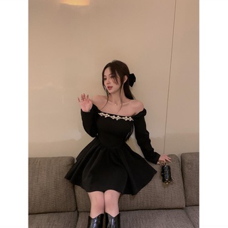 【F&X set】Đầm ngắn màu đen trễ vai thiết kế cổ điển phong cách Pháp cho nữ