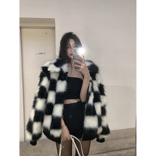 【F&X】Áo khoác lông thú tay dài nhỏ nhắn kẻ caro thời trang thu đông mới cho nữ 2021