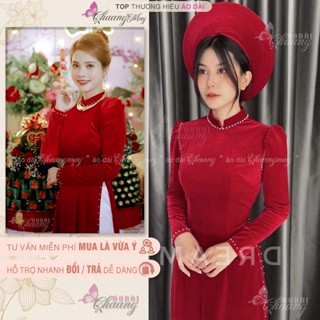 Áo dài nhung cô dâu cưới Chaang May sẵn cổ vuông tay vai bồng phồng đính ngọc dự tiệc lễ tết đẹp ADC500