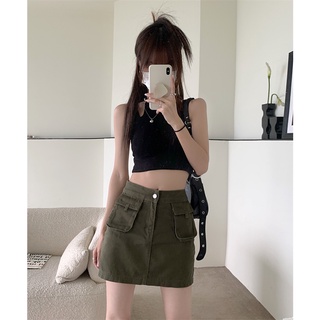 Huang YOYO Chân váy jean Ngắn Lưng Cao Mỏng Màu Xanh Lá Đa Năng Thời Trang Mùa Hè Hàn Quốc Bán Chạy Dành Cho Bạn Gái