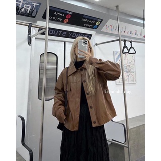 Khoác Bomber Da Cao Cấp PU Màu Nâu Unisex Nam Nữ Vintage- Áo Khoác Công Sở Đi Học