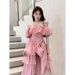 Đầm Hồng Tay Phồng Cổ Chữ V Phối Bèo Nhún Thiết Kế Lệch Tà Nữ Tính