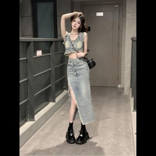 Set Áo Sát Nách + Chân váy jean Xẻ Tà Lưng Cao Thời Trang Dành Cho Nữ