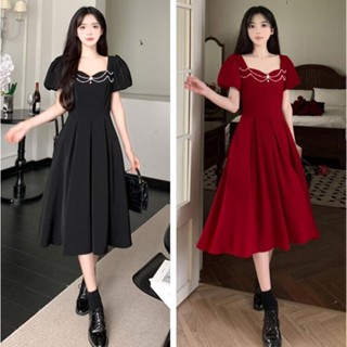 Đầm Công Chúa Cổ Vuông Ôm Eo Màu Lựu Đỏ Phong Cách Công Sở Mới Cho Nữ