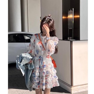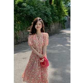 Đầm Chiffon Tay Phồng Cổ Chữ V Họa Tiết Hoa Thiết Kế Mỏng Xinh Xắn Thời Trang Theo Phong Cách Pháp