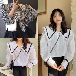 Áo sơ mi cổ bèo viền ren tay bồng- sơ mi nữ dài tay from rộng về 2 màu trắng caro phong cách ulzzang hàn quốc