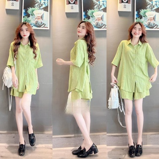 Sét Bộ Đũi Gân sước Buộc Nơ Lưng- đồ bộ áo sơ mi cộc tay lỡ phối cúc quần short lưng cao màu xanh cốm phong cách ulzzang